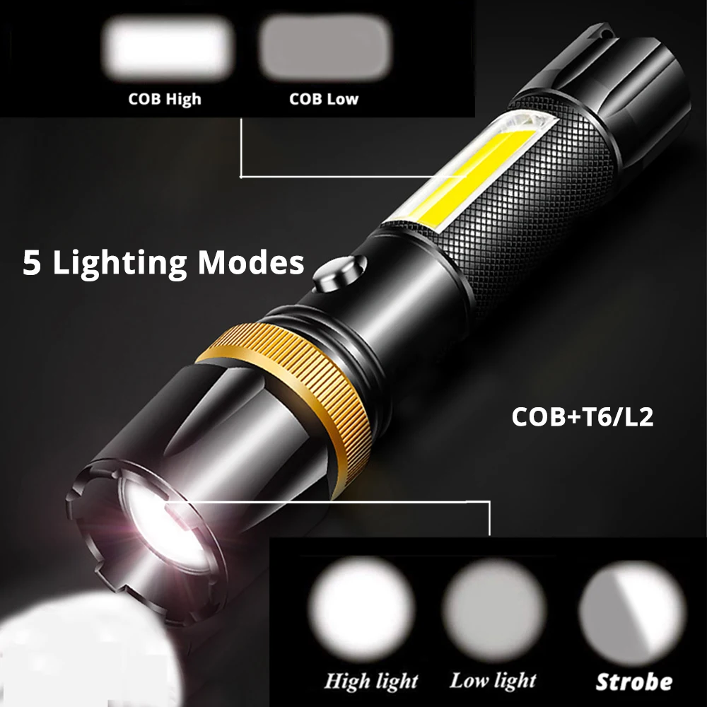 BEST SELLER Super bright Waterproof LED Flashlight With COB side light Rotary zoom 3 lighting modes Powered by